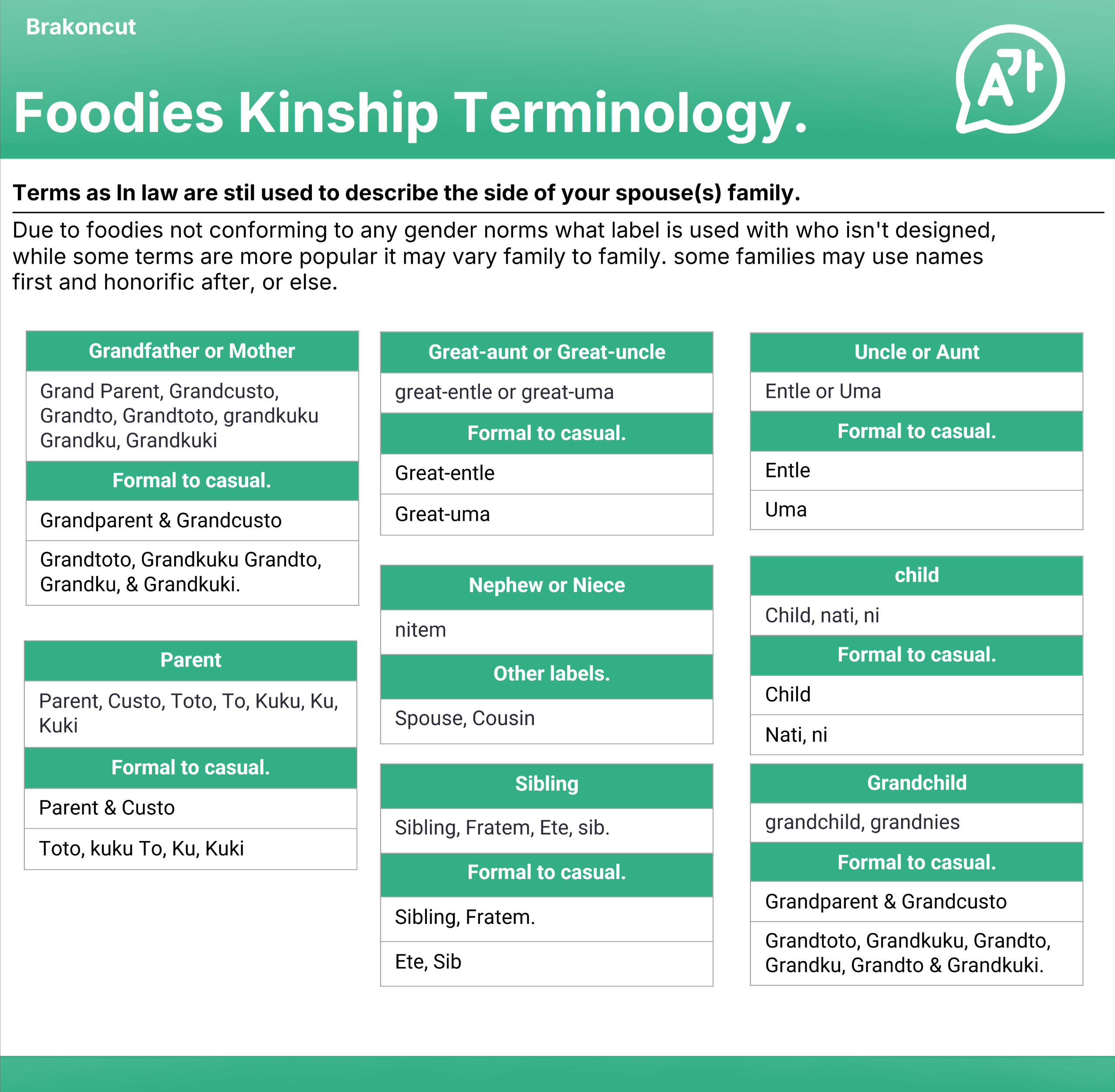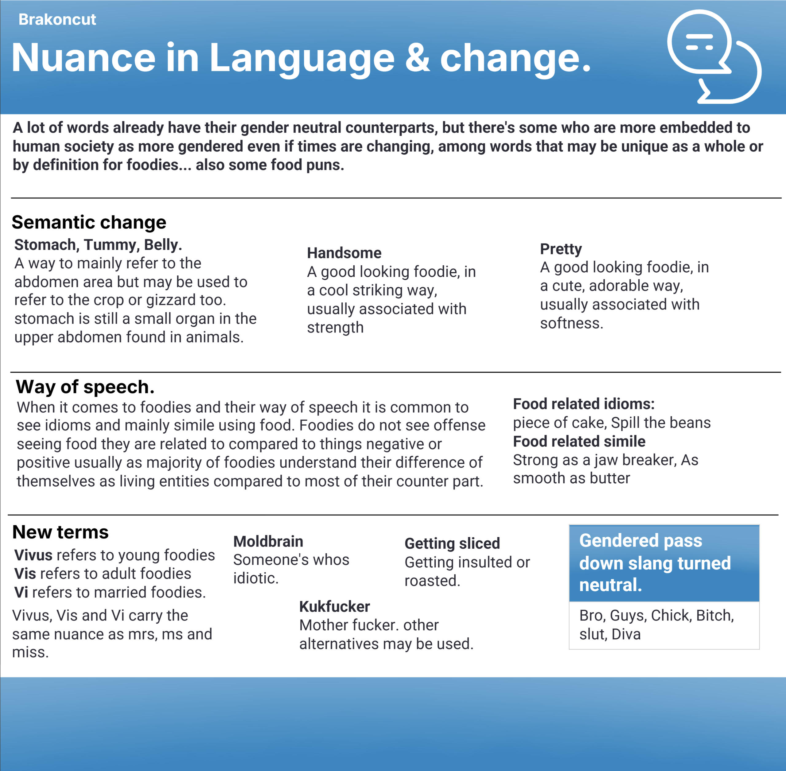| Ingredients are species of foodies that are not a meal but could be considered a part of one. Ingredients are fruits, vegetables, grains, protein foods, and dairy | Cuisine covers all types of foods outside of ingredients, those who were created as a combination of various ingredients, now its genetic and it's unknown why this evolution happened but it is embraced.. | Drinks are also another type of foodies that are mostly form of liquid. these type of foodies are more prone to adjust to aquatic abilities. |